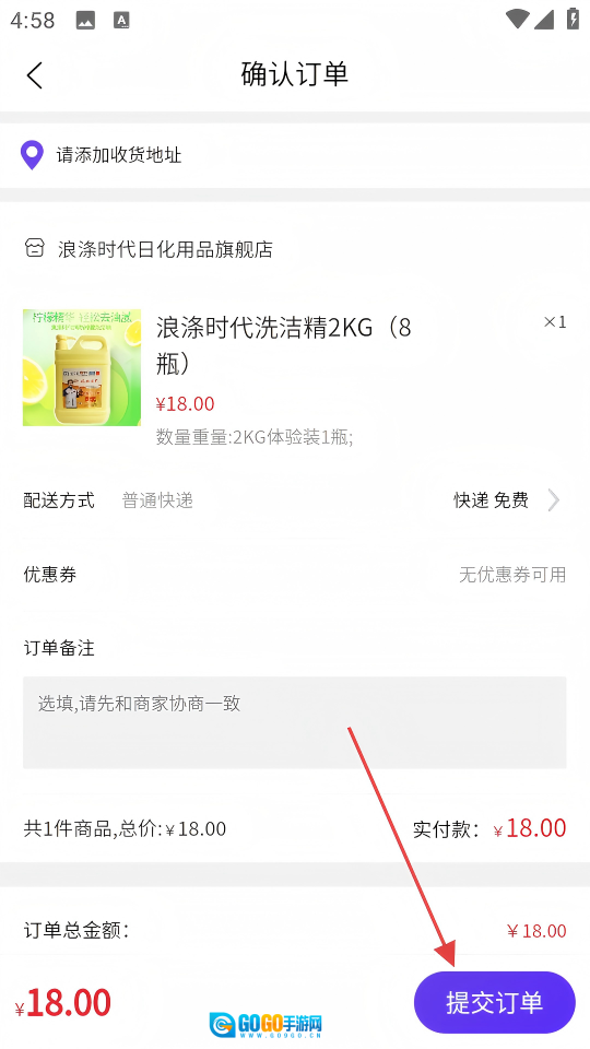 4、于确认订单页面,添加收货地址完毕后,点击【提交订单】按钮,从而完成购买操作。