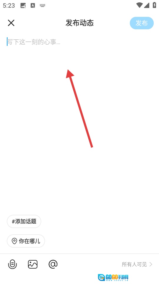 4、进入发布动态页面,在此页面进行内容编辑,完成编辑后即可发布动态。