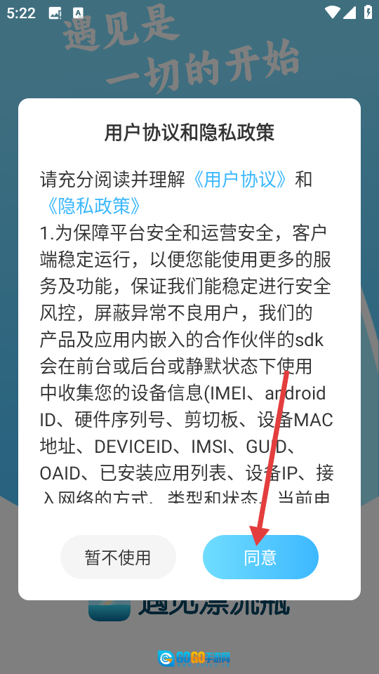 1. 于用户协议与隐私政策弹窗内,点击【同意】按钮,即可进入软件。