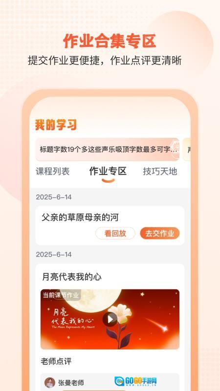 开开华彩作为一款面向中老年人的兴趣课程学习工具,拥有声乐、钢琴、书法、朗诵等多样的课程资源。它把每日课程安排以可视化形式呈现,便于用户查看课表,按时上课。不仅支持在线观看课程视频、参与直播课程并与老师实时互动,还能通过录制视频提交作业,查看老师的点评。此外,还能集中管理个人作品,助力中老年人随时随地学习专业技能,拓宽兴趣领域,提升自身技能,打造出便捷又高效的专属兴趣学习平台。