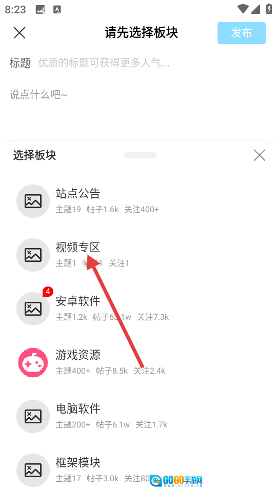 3、于板块选择页面,挑选【视频专区】,继而进入发布编辑页面。