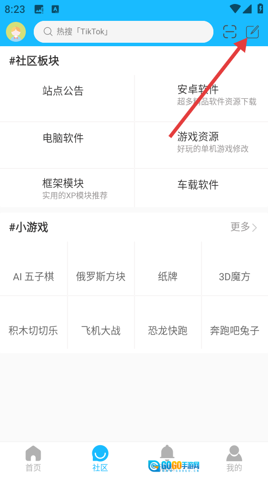 2. 在社区界面中,轻点右上角的编辑图标,即可进入板块选择页面。