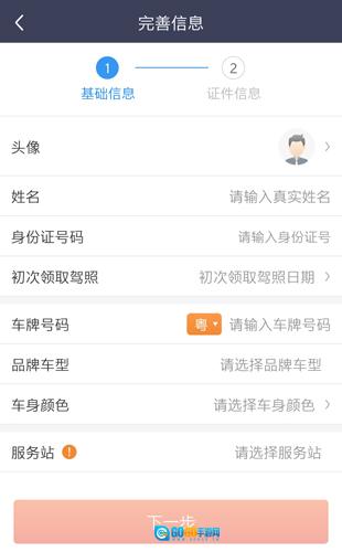 请填写姓名、身份证号码、初次领取驾照日期、车牌号码、品牌车型、车身颜色,然后点击服务站的“下一步”。