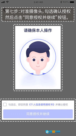 7、请将面部对准摄像头,勾选确认授权,随后点击“同意授权并继续”按钮,以完成人脸识别。