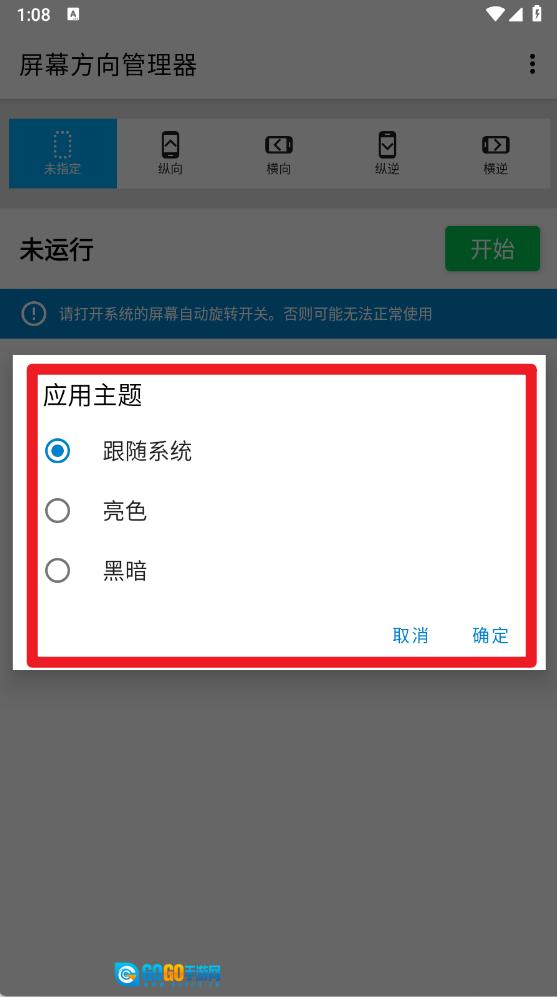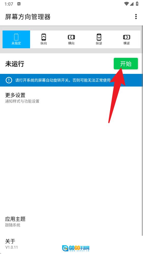 2. 在主界面上点击“开始”,就能开启屏幕方向管理功能。