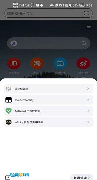 在这里,你能够查看已安装的扩展,像猫爪、油猴、广告拦截之类。