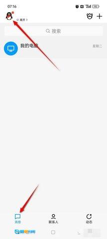 请在手机上打开QQ应用,然后点击位于屏幕下方菜单里的“消息”选项,或者点击“联系人”选项。