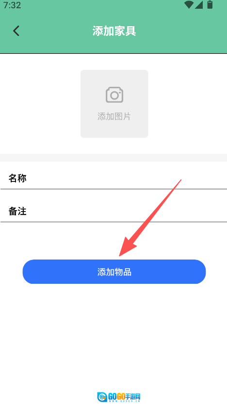 3、进入家具添加界面,填写名称与备注,点击“添加物品”,完成家具信息的记录。