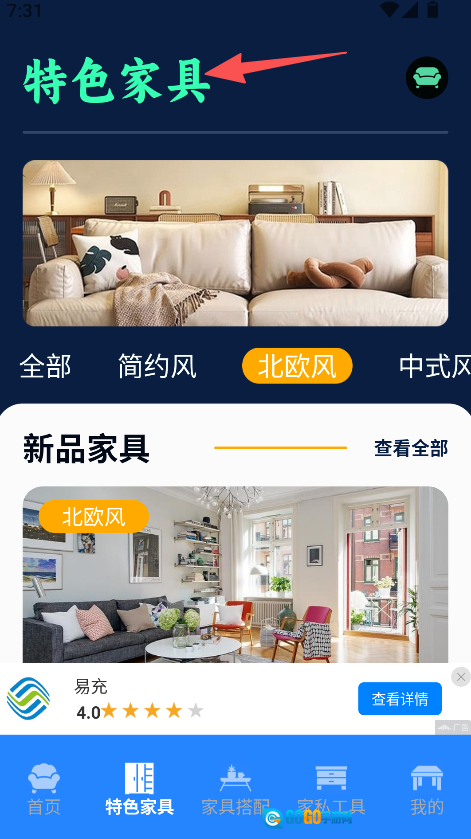 1. 开启软件,轻点特色家具选项,挑选风格(例如北欧风),随后浏览家具图片。