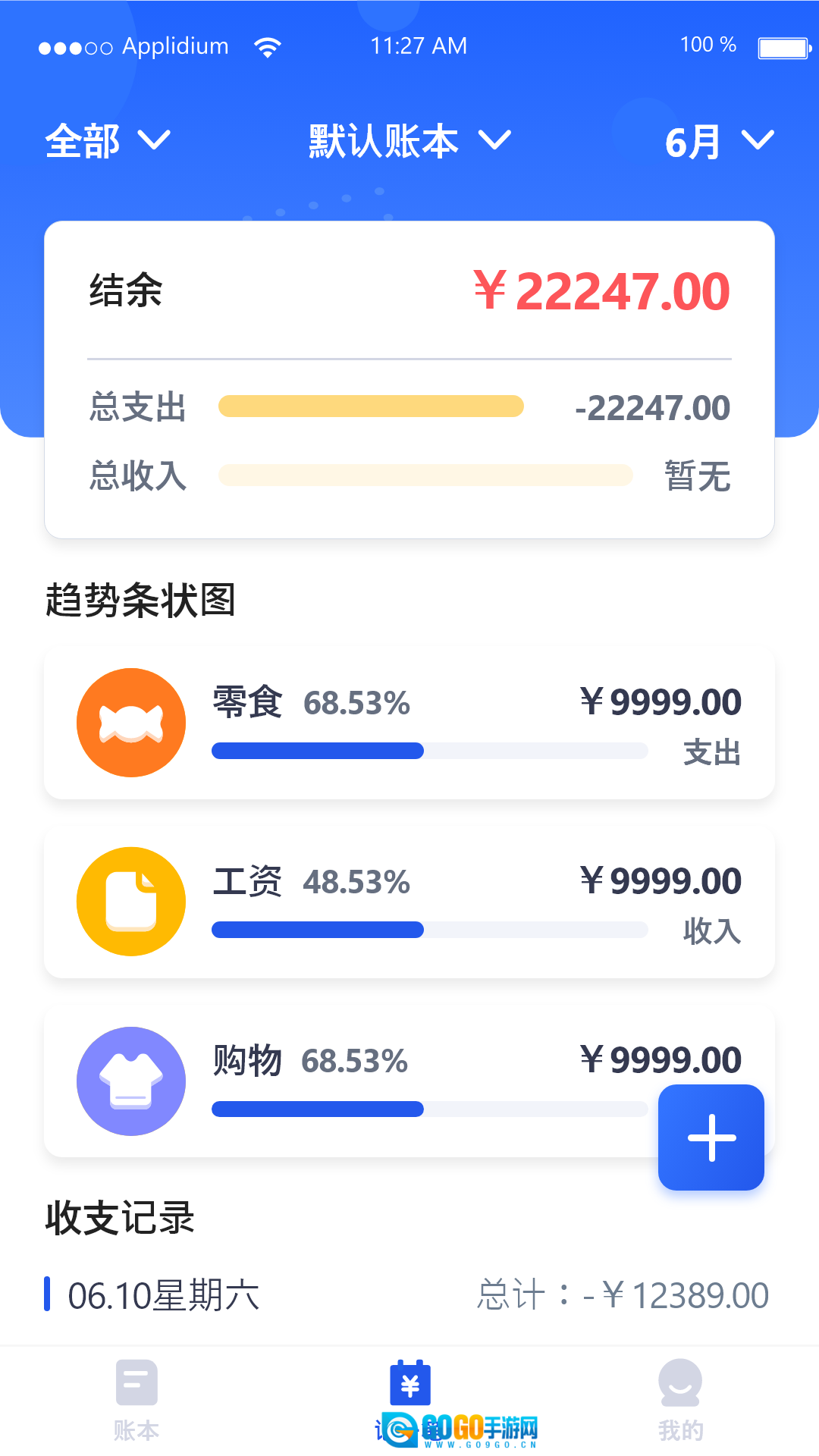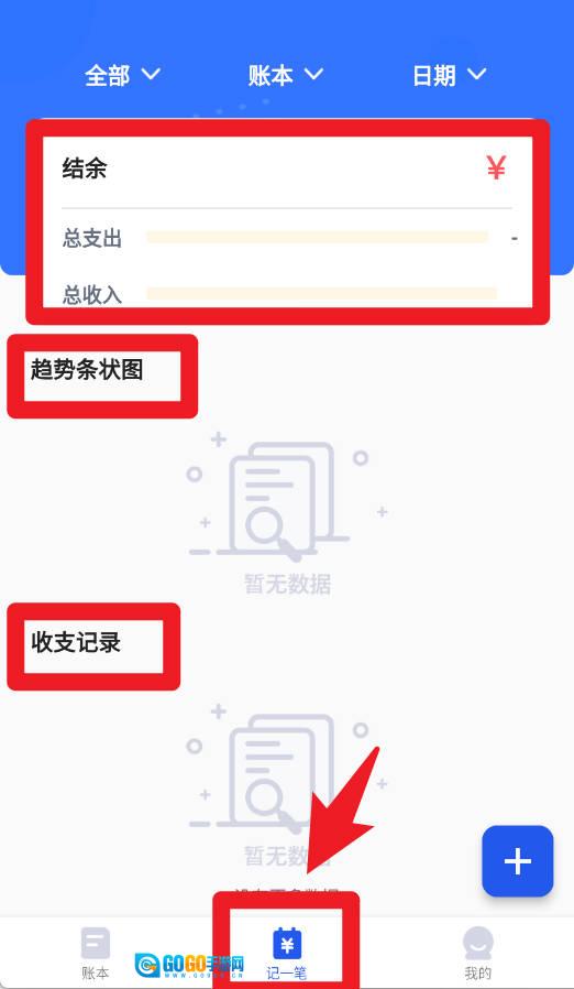 4、于记一笔界面,不仅能够查看结余、总支出及总收入,还可浏览收支记录与趋势条状图,使财务状况清晰呈现。