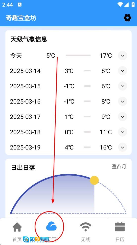 3、轻点 “天气” 选项,即可查看当日以及未来几日的天气状况。