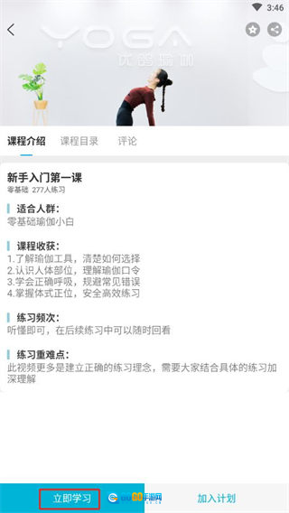 4、课程选定后,点击“立即学习”按钮,就能开启瑜伽学习之旅。
