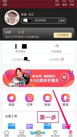 1、第一步:开启蜂鸟部落之后,于界面底部或者侧边找寻到“我的”选项,然后点击。