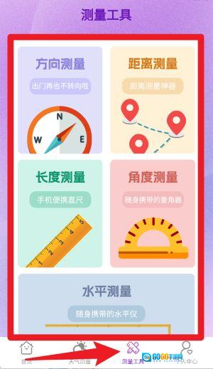 4、点击测量工具按钮,即可进入多功能测量区。该区域涵盖方向、距离、长度、角度以及水平这五种常用且实用的工具,能随时启用。