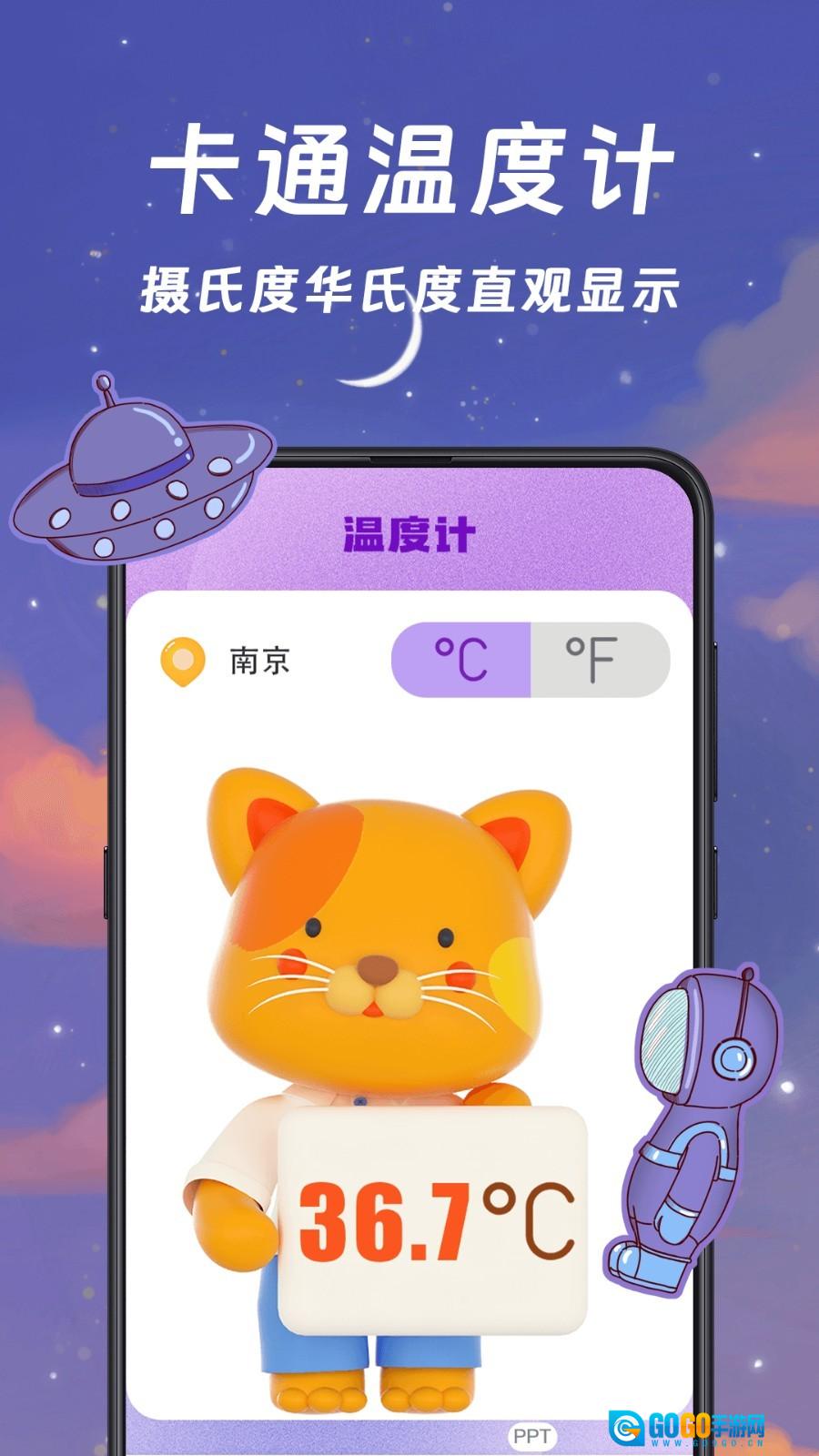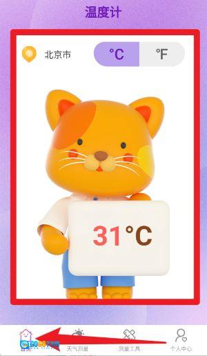 2、当您进入首页,系统将自动呈现当前所在城市的实时温度。画面中可爱的卡通猫会展示当前温度,其单位为摄氏或华氏,您还能手动进行温度单位的切换。