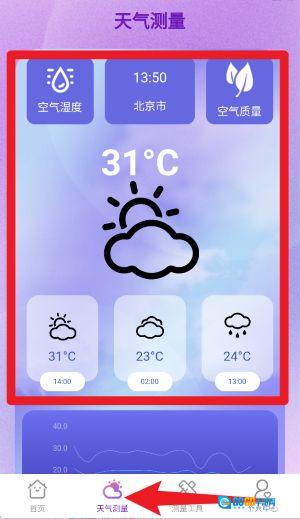 3、轻点底部的天气测量按钮,就能查看当前空气湿度、空气质量以及气温等相关信息,同时还支持查看小时级别的天气趋势图。