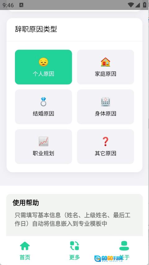 3、于功能界面挑选辞职原因(例如个人发展、家庭安排之类)以及辞职信类型(像正式版、简洁版等)。
