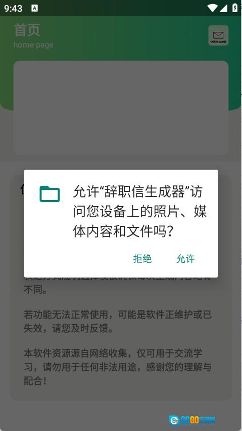 1、完成本站辞职信生成器软件的安装后,将其打开,接着根据提示同意所需的使用权限。