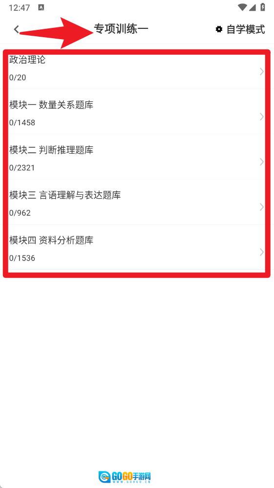 3、点击“专项训练”,便能在政治理论、数量关系、判断推理、言语理解、资料分析等模块中挑选进行练习。