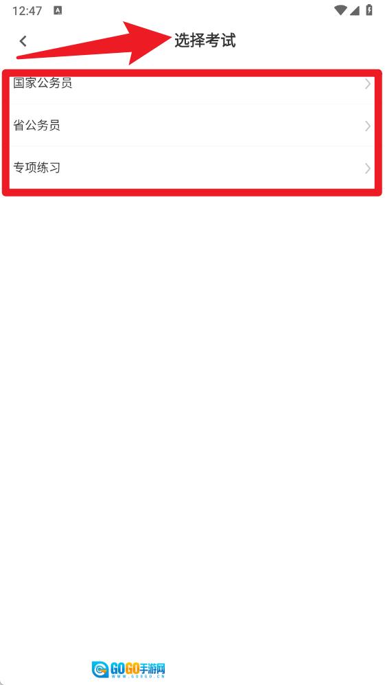 1、当进入应用后,于选择考试的界面里挑选国家公务员、省公务员或者专项练习模块。