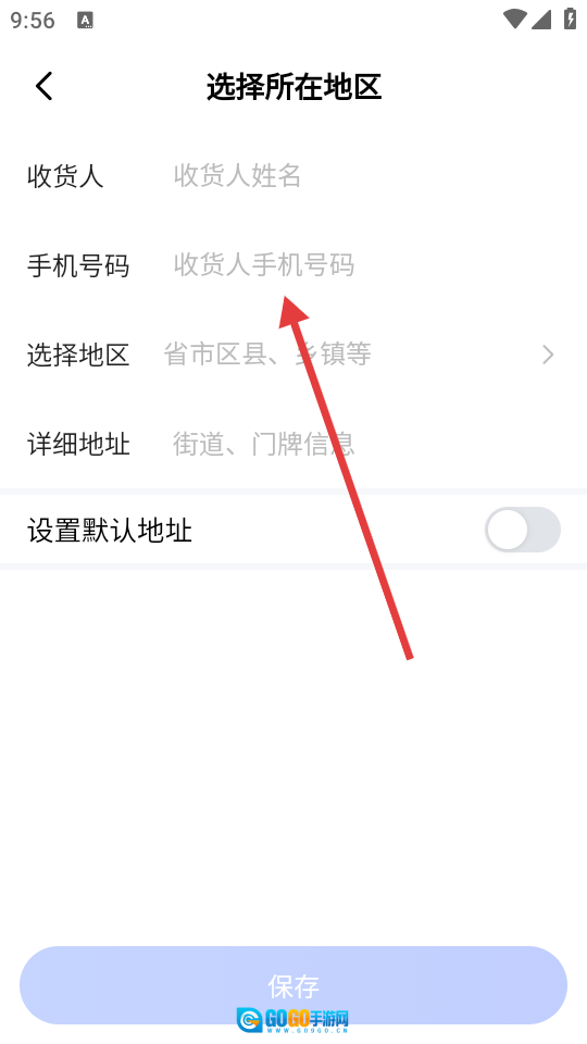 4、于地址编辑页面,填写【收货人】、【手机号码】、【选择地区】等相关信息,完成默认地址设置后,点击保存。