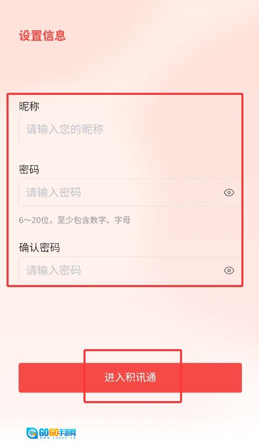 4、于信息设置界面,填好昵称、密码并完成确认操作,便可成功注册并登录系统。