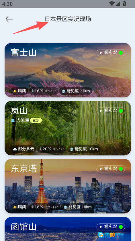 1. 开启软件,进入日本景区实时场景,查看富士山、岚山等景区清单。