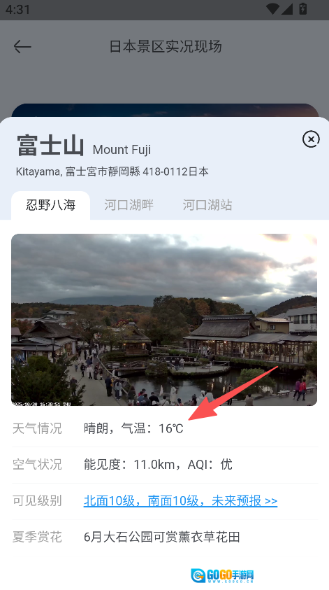 2、挑选富士山,查看其天气状况(例如晴朗,气温为16℃ )。