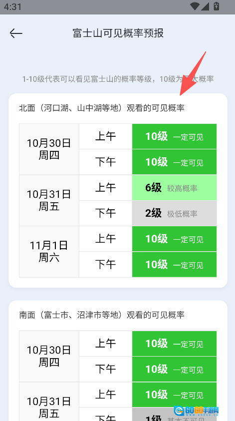 3、进入富士山可见概率预报页面,查看未来几天的可见等级,据此规划游览时间。
