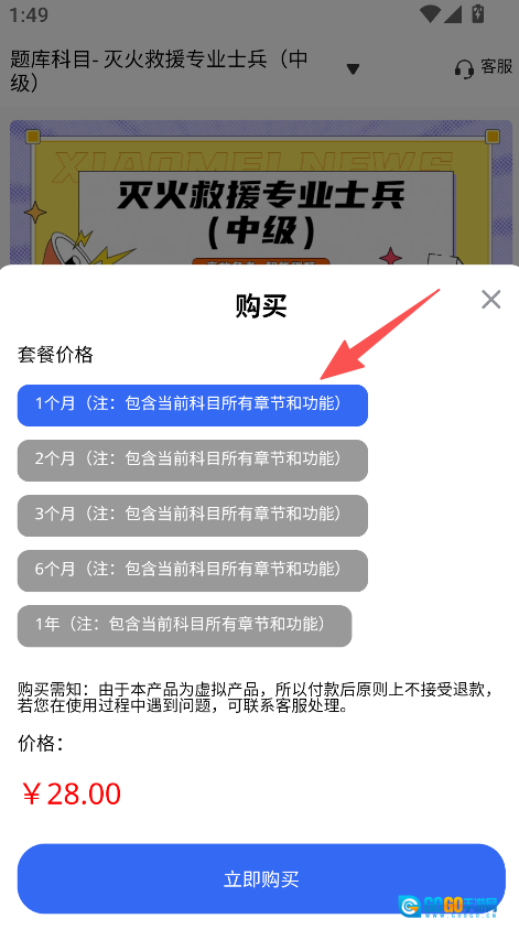 3、浏览购买套餐,挑选时长(例如1个月),知悉备考服务。