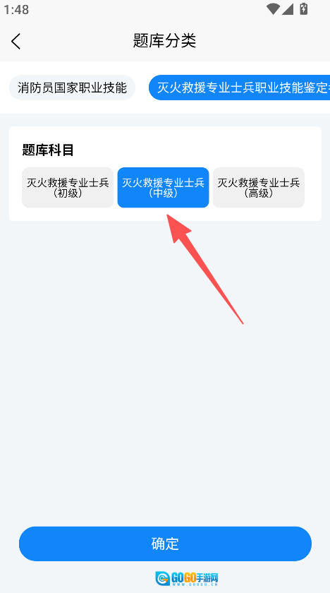1. 前往题库分类,挑选级别(例如灭火救援专业士兵中级),然后点击确定。