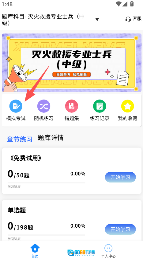 2. 在题库页面,挑选练习方式(比如模拟考试),随后开启刷题。