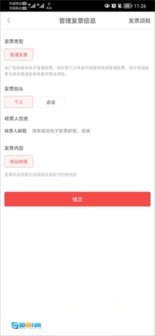 3、可选择发票抬头为个人或企业。若选择企业发票,需填写单位名称与纳税人识别号。完成收票人信息输入后,点击【确定】即可。