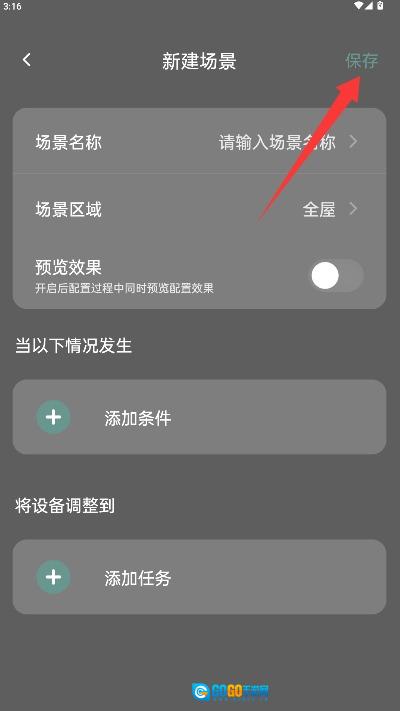 4、依次输入场景名称、场景区域,并选择是否开启预览效果,添加条件与任务后,点击保存即可。