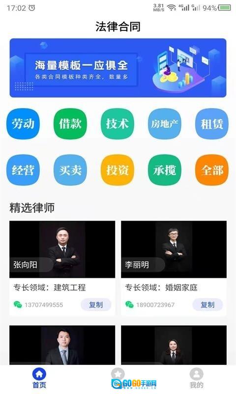 2. 在首页顶端,能够挑选不同类型的合同模板,涵盖劳动、借款、技术、房地产、租赁等类别。