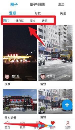 4、在圈子板块里,点击“发现”下方的标签,就能浏览牡丹江、本地话题等热门动态,还可查看网友发布的短视频。