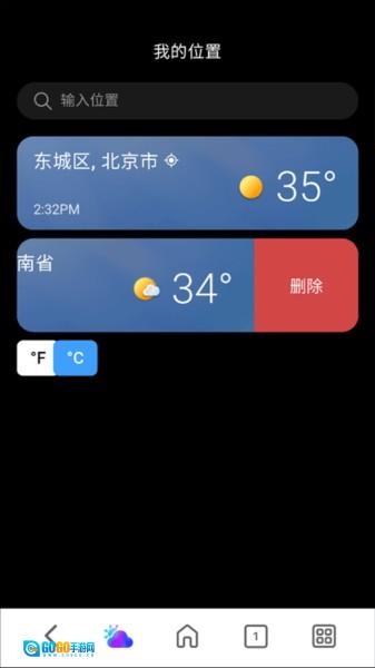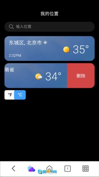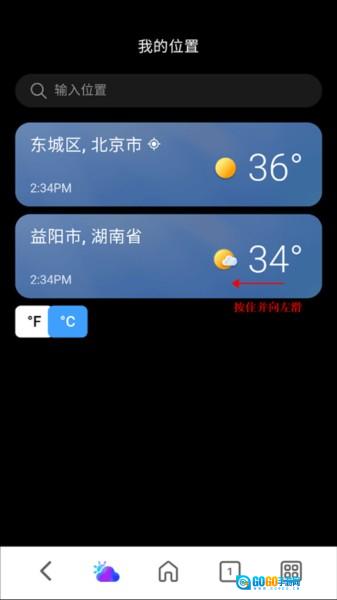 1、进入天气界面,点击左上角,进入“我的位置”界面。在此界面的位置列表里,选中你想要删除的城市,然后向左滑动该城市选项。