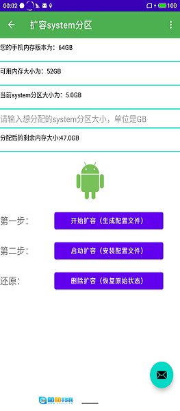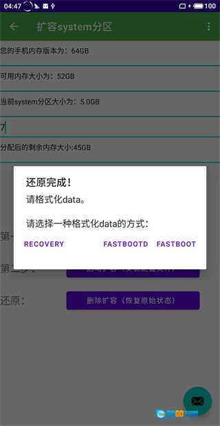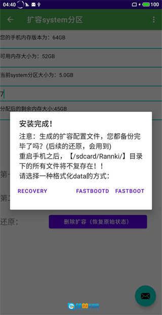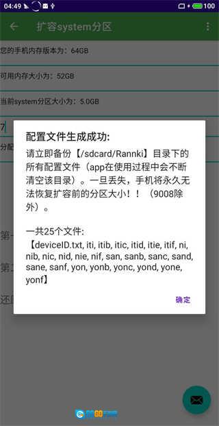 还原步骤如下:预先把之前生成的25个扩容配置文件,拷贝至/sdcard/rannki目录里,接着点击删除扩容按钮,随后便会提示还原成功,具体操作如上述所示。