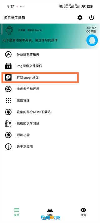 1. 开启多系统工具箱App,在菜单中点击选择【扩容super分区】。