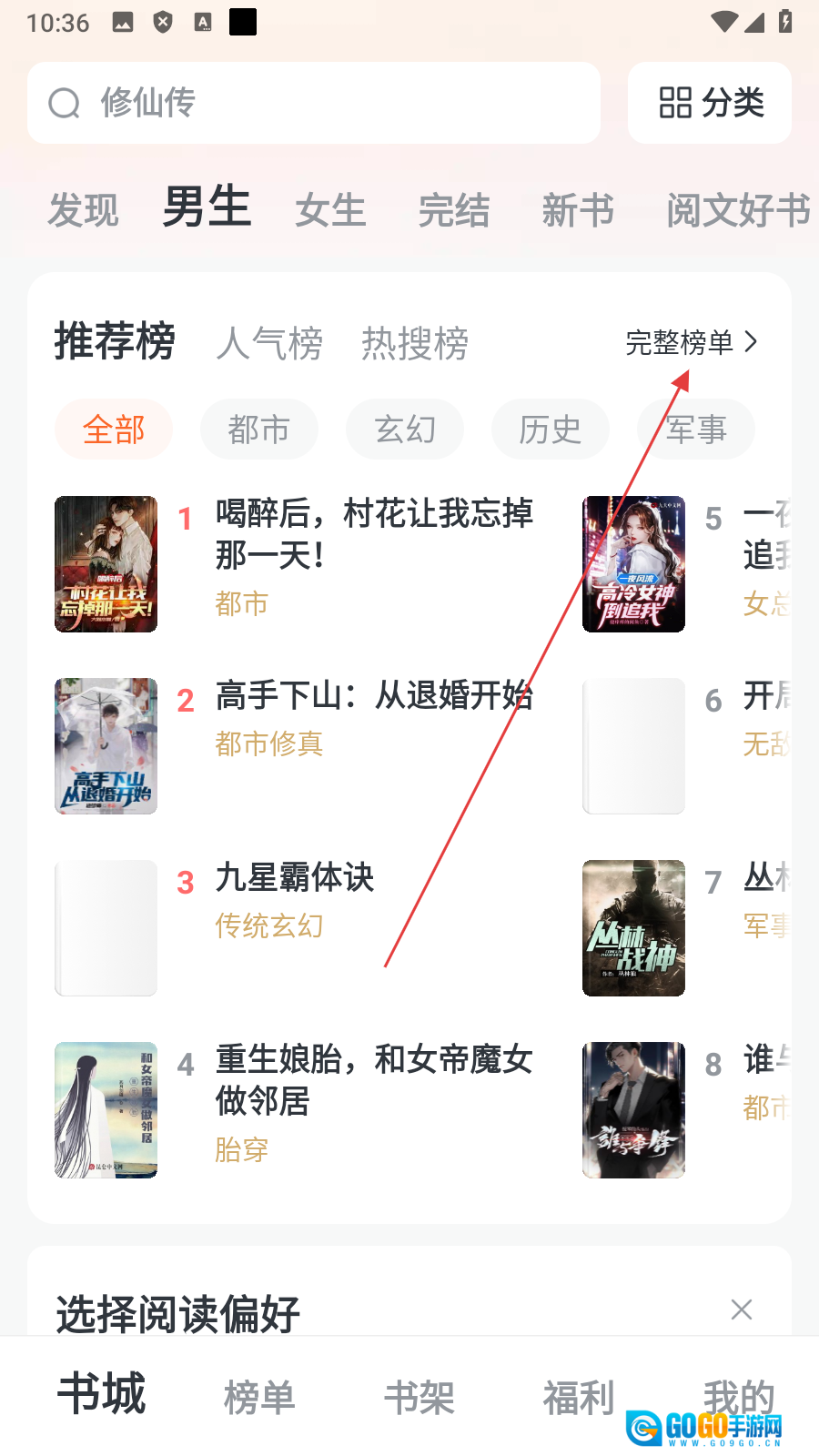 1、点击【完整榜单】,进入全免推荐榜页面。