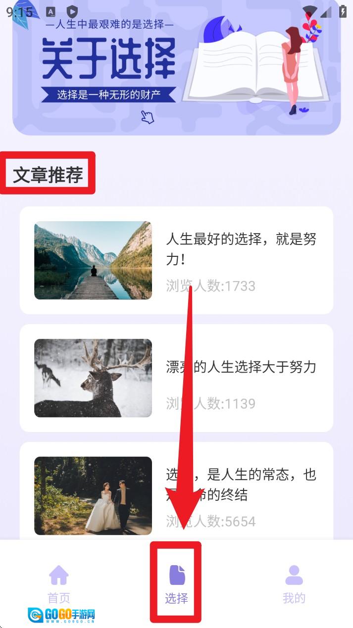 2. 轻点页面下方的选择标签页,进入文章推荐区域,浏览与选择相关的内容,从中汲取灵感。
