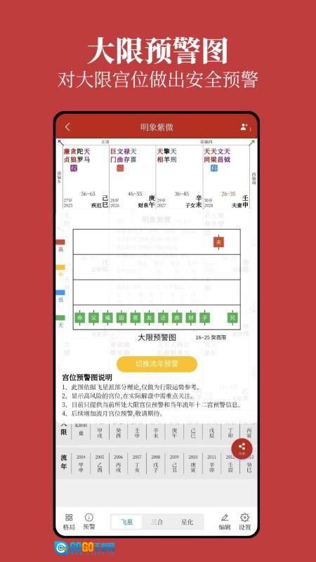 明象致力于让用户切实体验到更专业、全面的紫薇斗数服务。在此,你能详细了解丰富信息,更便捷地知晓飞星转数与大限预警,还可全面认识十二宫飞星图。不仅如此,用户还能进行自定义编辑与设置,方便记录与使用,享受贴心服务。感兴趣的朋友,快来体验吧!