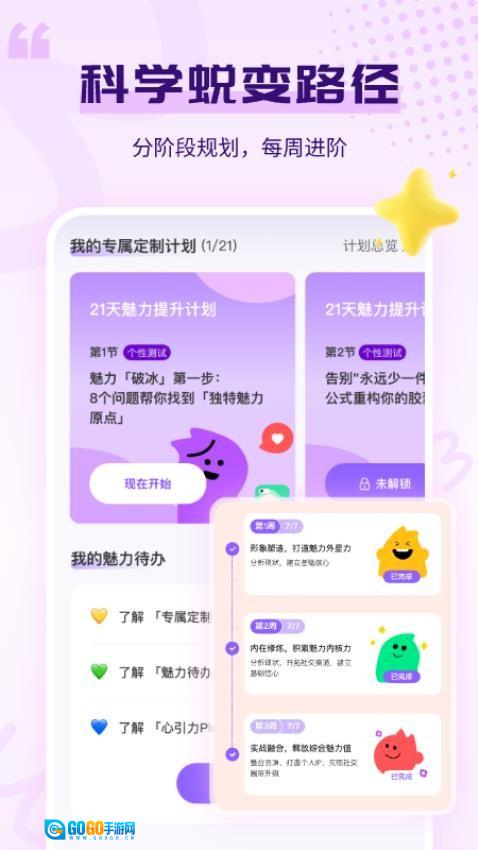 分阶段的规划自己的计划,方便用户能高效完成,轻松解锁更多魅力提升的计划;