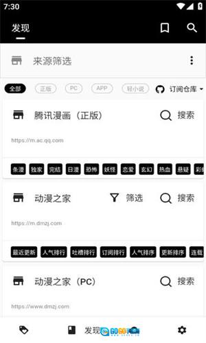 5、耐心等待订阅成功,订阅完成后,进入“发现”板块,便能看到众多漫画平台,像腾讯漫画、动漫之家、布卡漫画、漫漫漫画以及可米酷等都在其中。