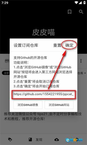 4、完成上一步操作后,订阅仓库界面会自动在下图圈起来的地方填入地址,接着点击右上角的“确定”。