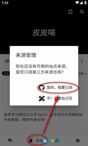 1. 打开皮皮喵漫画,点击底部的“发现”,此时会弹出提示“现在还没有可用的站点来源,是否订阅第三方来源仓库”,接着点击“是的,我要订阅”。