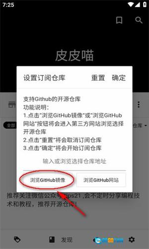 2、在“设置订阅仓库”处,点击左边的“浏览GitHub镜像”,该选项可直接打开。右边还有“浏览GitHub网站”。