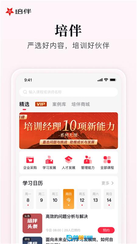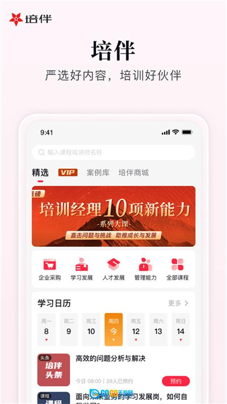 培伴 App 重点打造培训行业八大细分领域“培训管理、人才发展、内训师、人力资源、职场提升、团队管理、组织管理、业务能力”,满足用户系统化学习需求,强化用户在线学习、优质内容搜索、资源匹配等功能的体验。