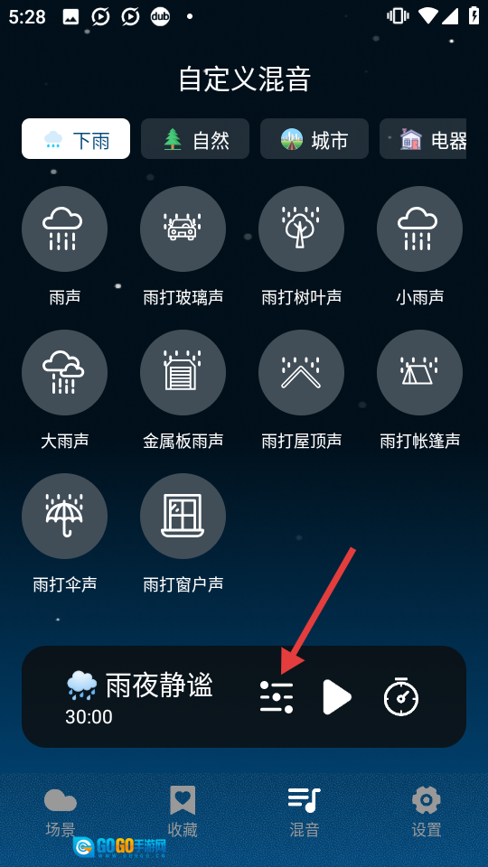 2、于自定义混音页面,轻点【雨夜静谧】下方的设置图标,即可进入声音编辑界面。