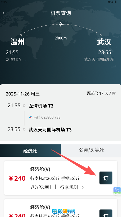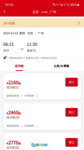 3、于航班详情页面确认行程以及票价,点击“订”按钮,从而进入预订流程。